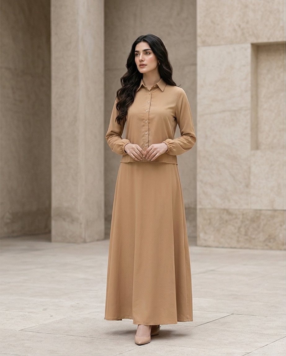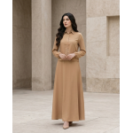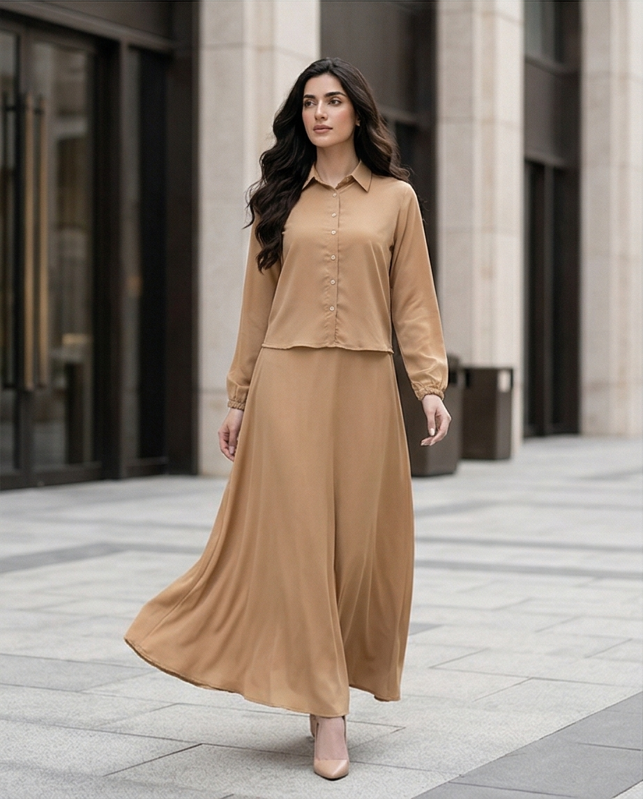 ​The beauty of a georgette maxi dress in a neutral camel tone is its limitless styling potential. For a “monochrome-chic” look, pair it with nude heels and gold hardware accessories. To add a touch of edge, contrast the soft camel hue with a black leather belt and ankle boots. Its modest cut and full-length coverage make it an exceptional choice for formal events, religious gatherings, or upscale daily wear where elegance is a requirement, not an option.