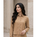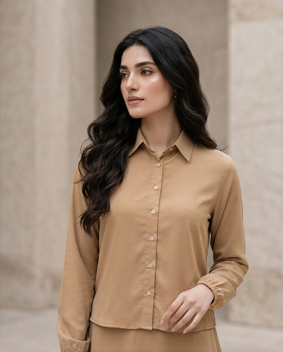 ​The Camel Georgette Maxi features a sophisticated “hybrid” design that creates the illusion of a perfectly coordinated two-piece set. The upper bodice is inspired by classic shirt-making, featuring a sharp pointed collar, a functional button-down placket, and long sleeves finished with delicate, elasticated cuffs. This structured top provides a professional and tailored frame that balances the softness of the fabric.