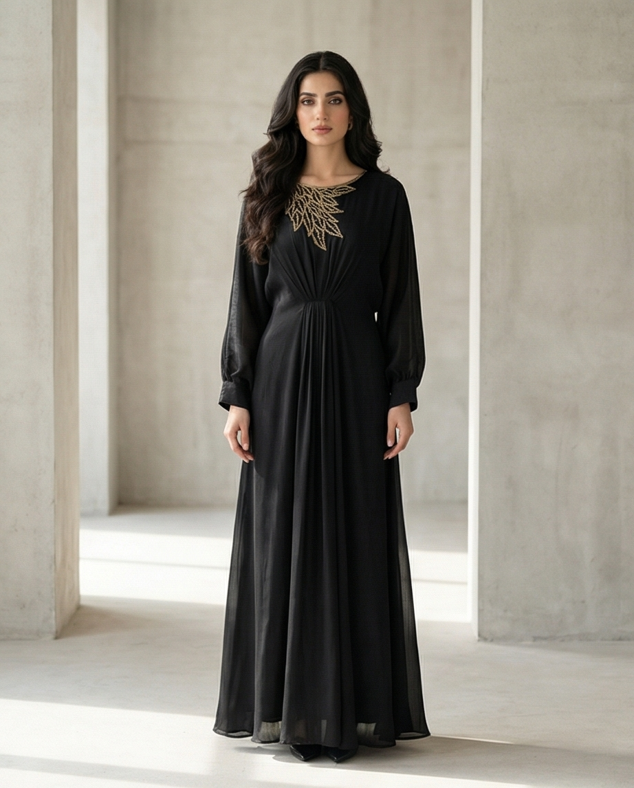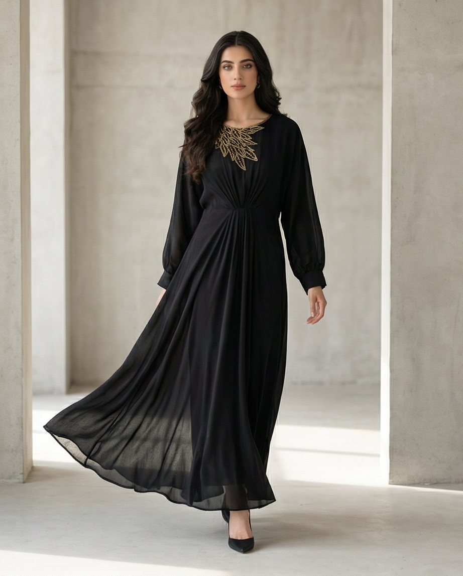 ​Unlike traditional one-piece gowns, this cotton lava kaftan dress set features a smart two-piece construction. It includes a long-sleeved, button-down shirt upper with a classic collar, providing a structured, polished look. This is paired with a matching floor-length A-line skirt that offers a fluid, modest drape. The separate pieces allow for creative styling; wear them together for a seamless monochromatic look, or pair the shirt with tailored trousers for a sophisticated office ensemble.