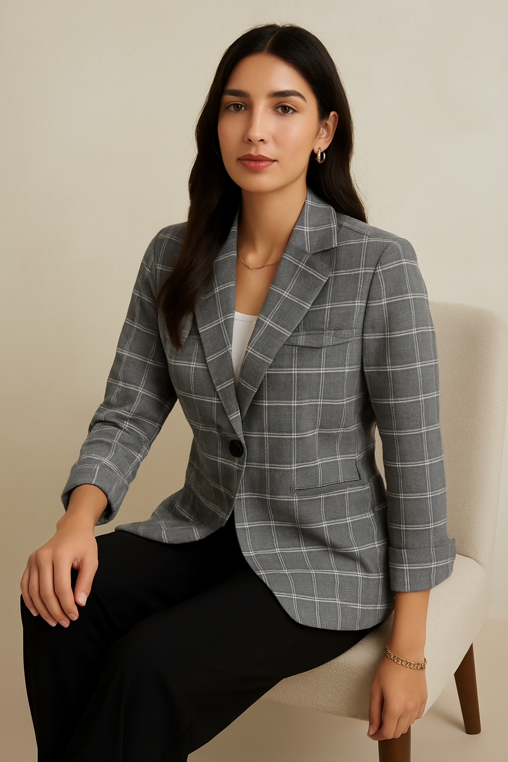 Make a bold and timeless statement with the Grey Monarch Blazer, a checkered women’s blazer crafted for sophistication and versatility. Its structured tailoring and refined design create the perfect balance between elegance and confidence, making it a wardrobe essential for modern women.