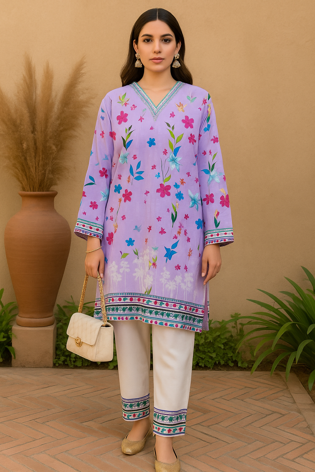The lilac kurta is adorned with an array of multicolored floral prints in shades of pink, blue, green, and yellow, creating a fresh and lively aesthetic. The lightweight fabric flows effortlessly, making it suitable for warm weather while maintaining a polished and refined appearance. The V-neckline is accentuated with delicate embroidered detailing that frames the face beautifully, adding a hint of sophistication. Long sleeves and a straight silhouette ensure modesty while allowing complete ease of movement for all-day wear.