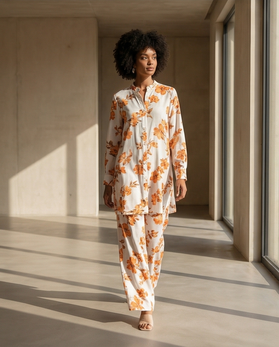 ​Inject a burst of energy into your seasonal wardrobe with our Marigold Bloom Irish Linen Co-ord Set. This two-piece ensemble features a captivating, large-scale botanical print in shades of burnt orange and honey-gold, set against a clean, ivory backdrop. Designed for the woman who loves vibrant, expressive fashion, this set offers a perfect balance between bold personality and effortless, relaxed tailoring. Whether you’re attending a seaside brunch or exploring a new city, this coordinate set ensures a picture-perfect look.