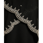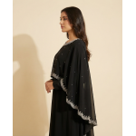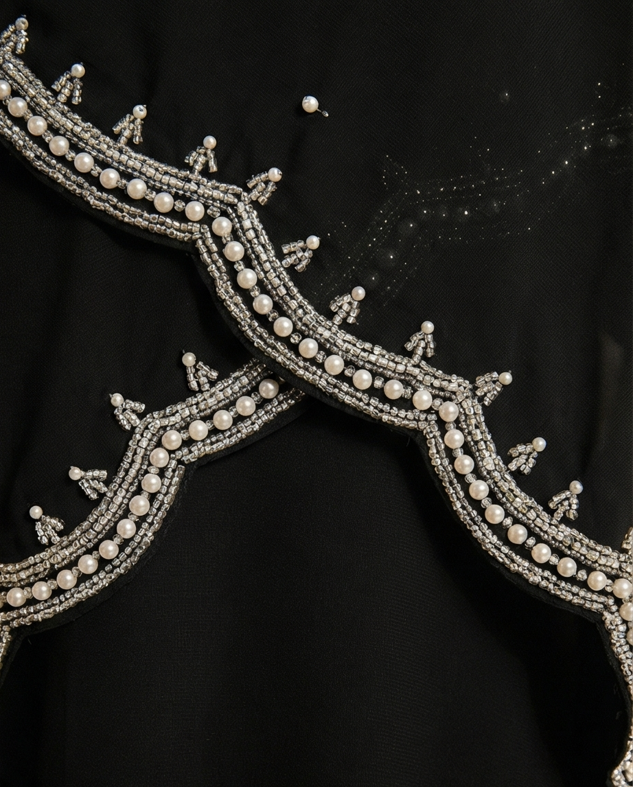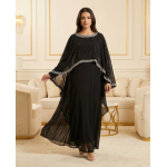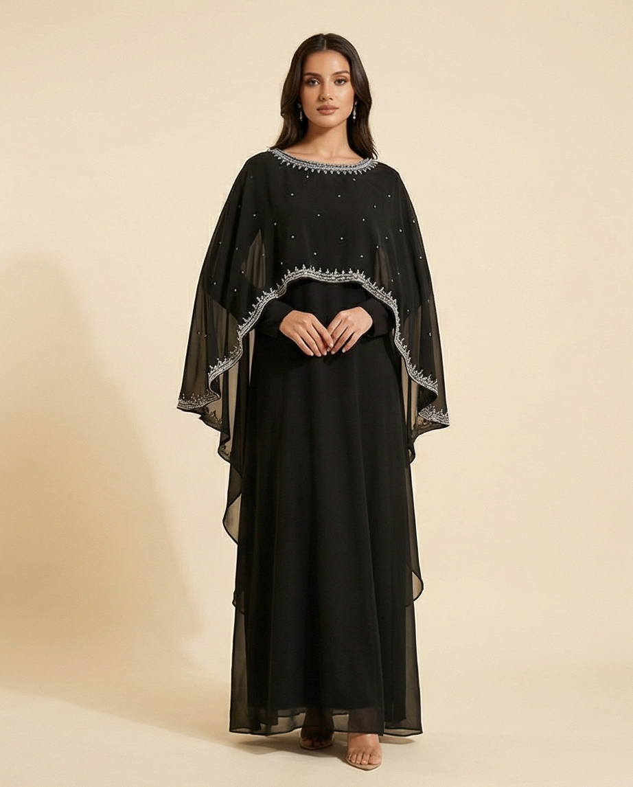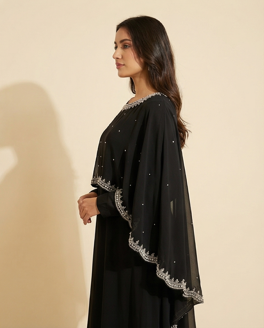 ​The gown features a two-piece construction for a truly personalized fit. The inner is a sleeveless A-line maxi that skims the frame for a slimming, elongated effect. To ensure the perfect silhouette, the back is fully adjustable, allowing you to customize the cinch to your comfort. Layered over the inner is a separate, flowing silk cape top. This overlay is detailed with an intricately embroidered boat neckline and a matching shimmering border, adding a touch of silver brilliance to the deep noir palette.