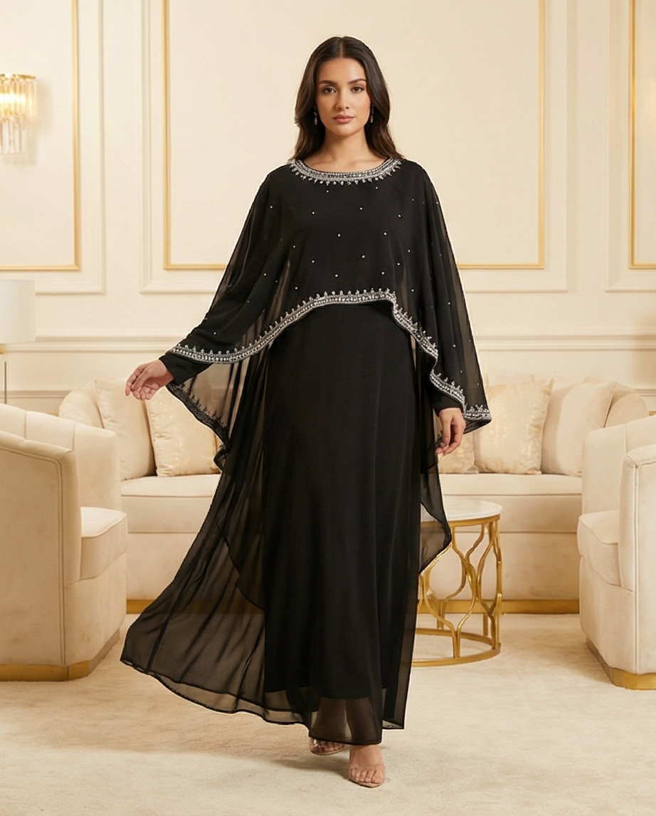 ​Make a grand entrance in the Midnight Silk Cape Gown, an avant-garde take on the classic black formal. This ensemble is meticulously designed to offer a regal “butterfly” silhouette that commands attention through architectural grace. Crafted from premium shamoz silk, the fabric delivers a soft, liquid-like luster that catches the light with every movement, ensuring you remain the focal point of the night.