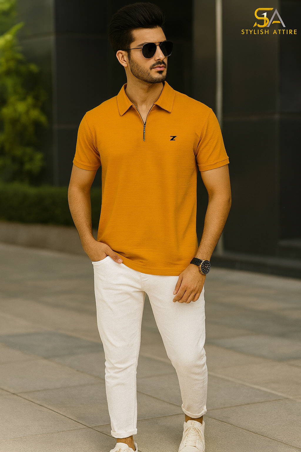 Mustard Zipper Polo Shirt – Bold Color, Modern Style