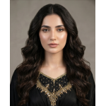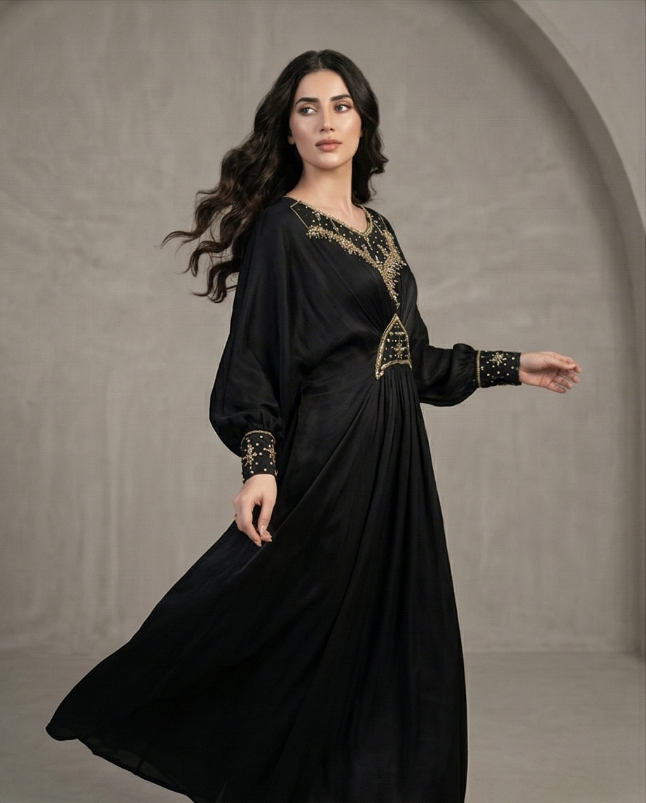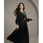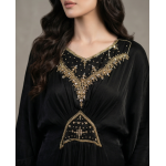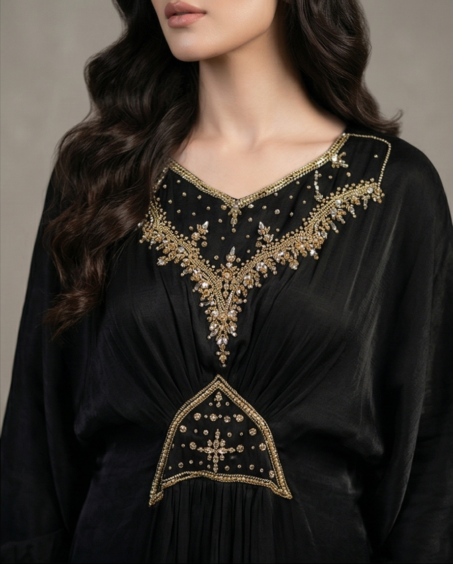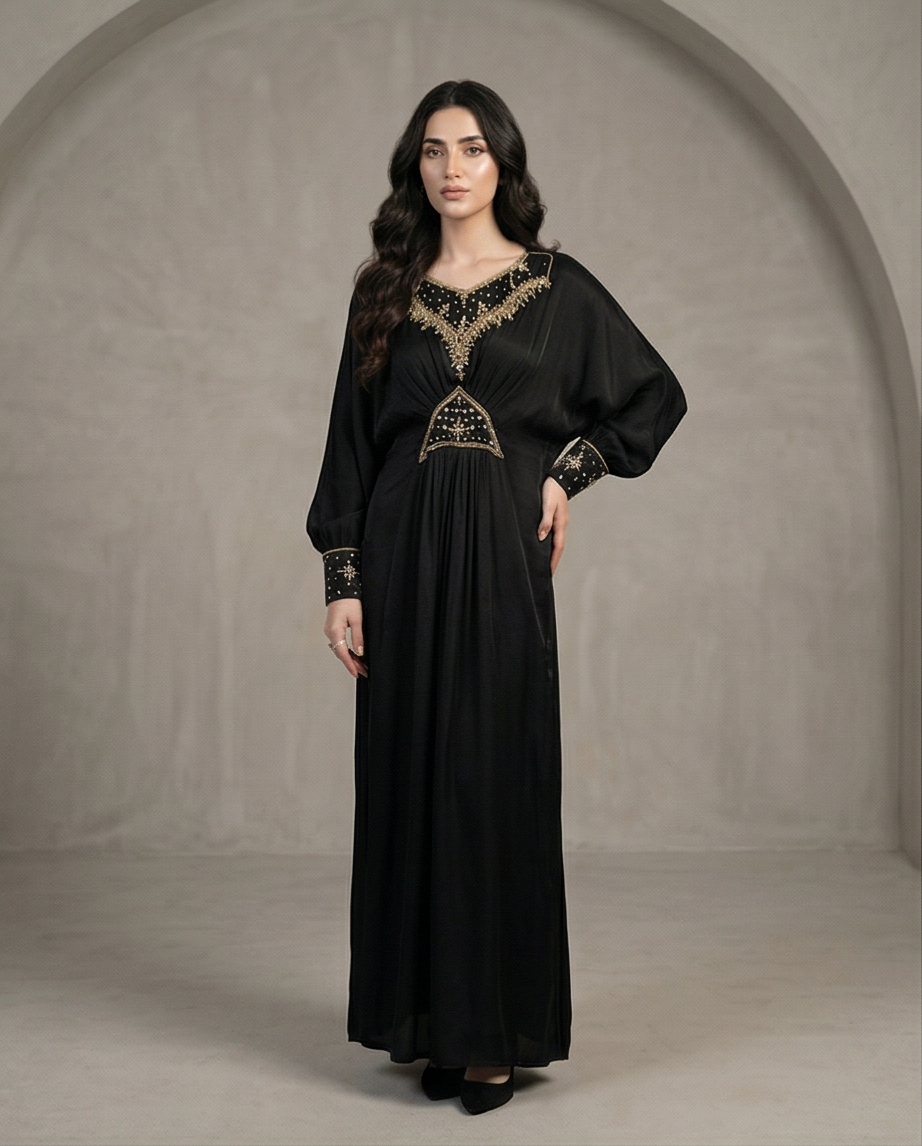 ​Step into sophistication with the Noir Gilded Cotton Kaftan. This floor-sweeping gown is defined by its deep, midnight black hue and intricate artisanal detailing. Crafted for versatility, it serves as the perfect ensemble for high-end festive gatherings, evening soirées, or formal cultural events. The centerpiece of this design is the exquisite gold zari embroidery and delicate beadwork that adorns the V-neckline and the structured waist panel, creating a flattering, cinched effect that celebrates the female form without compromising on modesty.