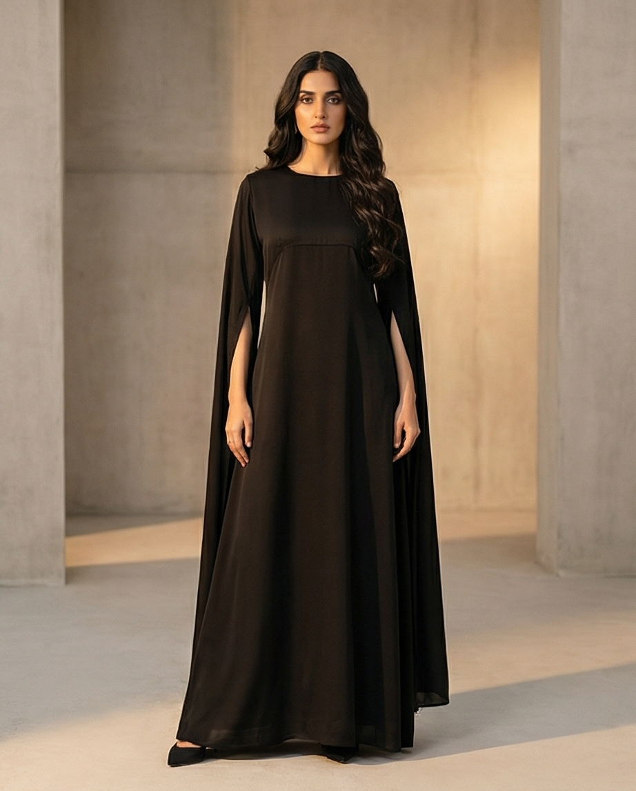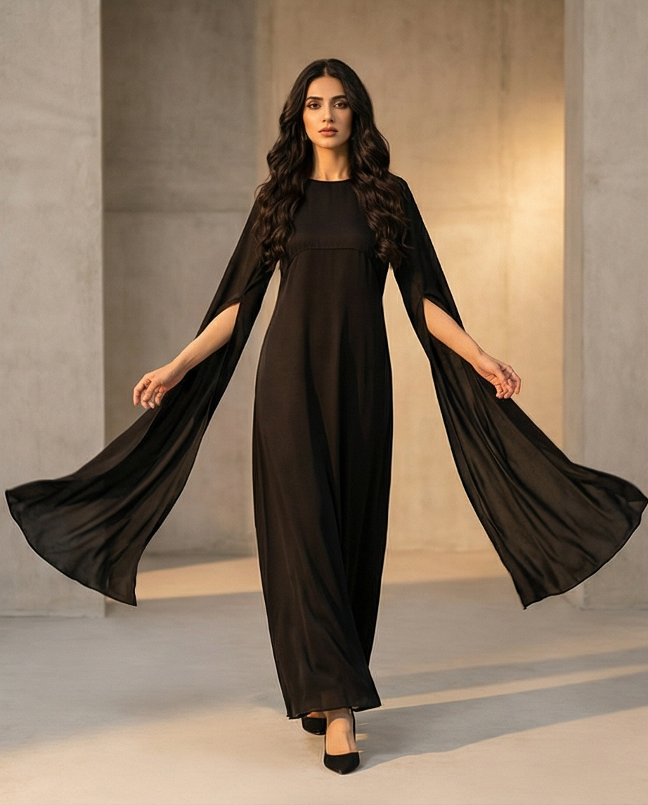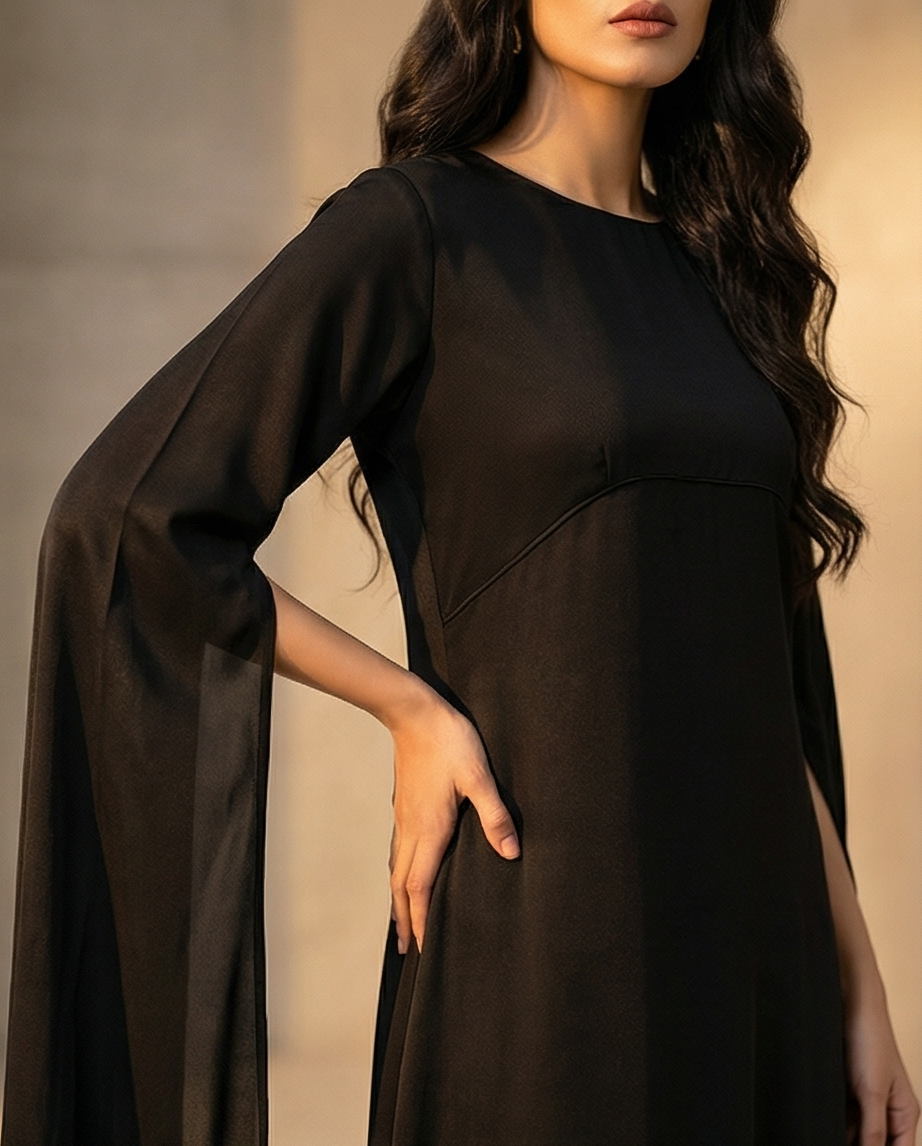 ​The focal point of the Noir Silk Cape Maxi is the avant-garde split-sleeve design. These dramatic, floor-length sleeves act as a built-in cape, trailing behind you with a majestic sweep that adds cinematic flair to every movement. The bodice is cut with a sleek, modest boat neckline that provides a clean and polished look, balancing the bold energy of the sleeves.