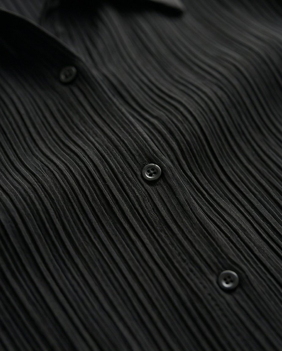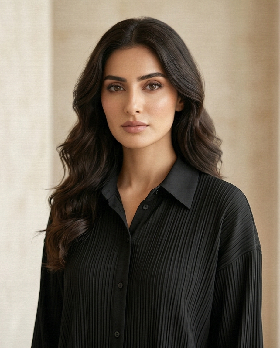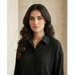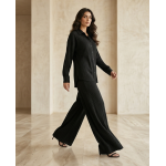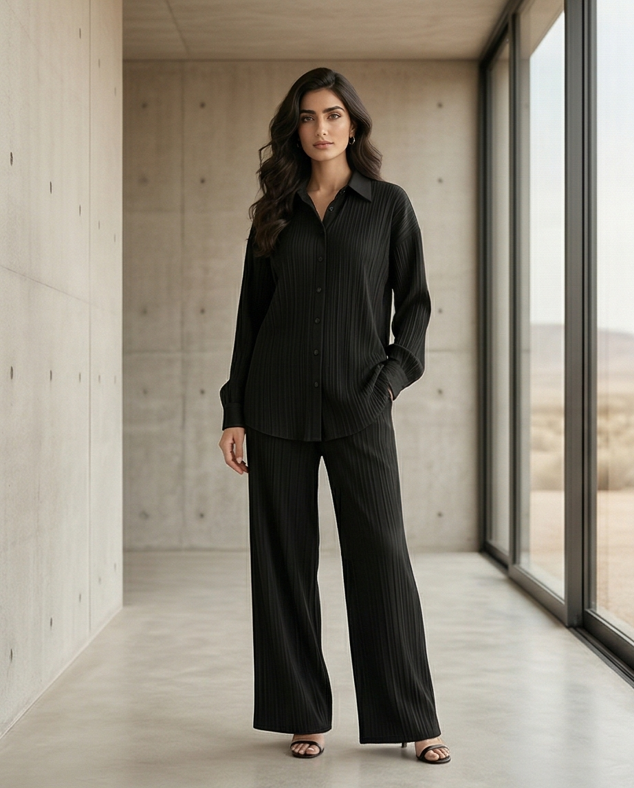 ​The set features a classic button-down shirt with a clean-cut collar and a curved hemline that offers elegant coverage. This is paired with matching wide-leg trousers that provide fluid movement and a modern, high-fashion aesthetic. The long sleeves feature buttoned cuffs, allowing you to wear them full-length for a formal look or rolled up for a more relaxed, “off-duty” vibe.