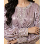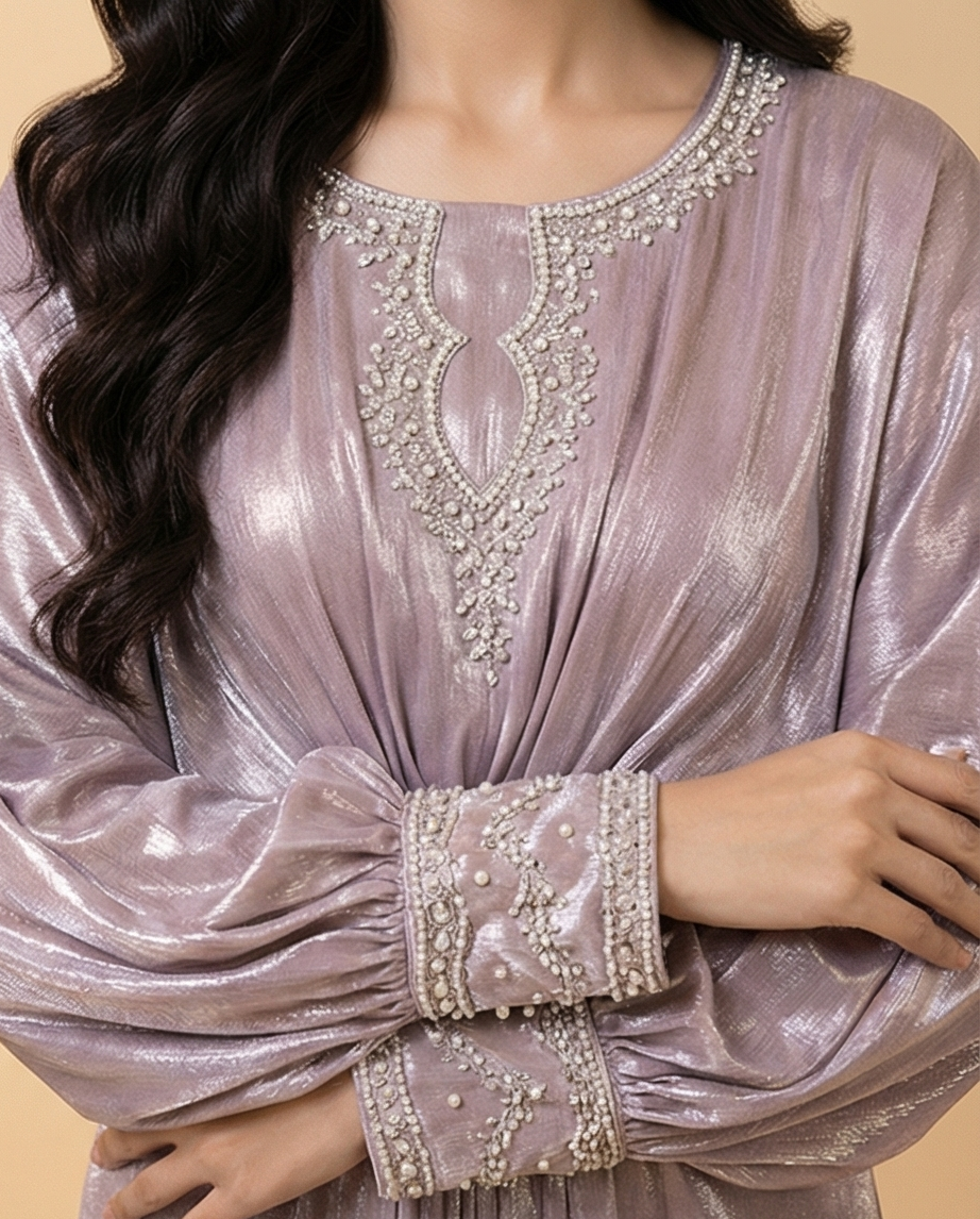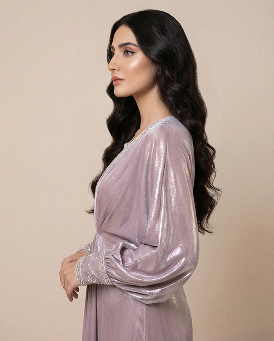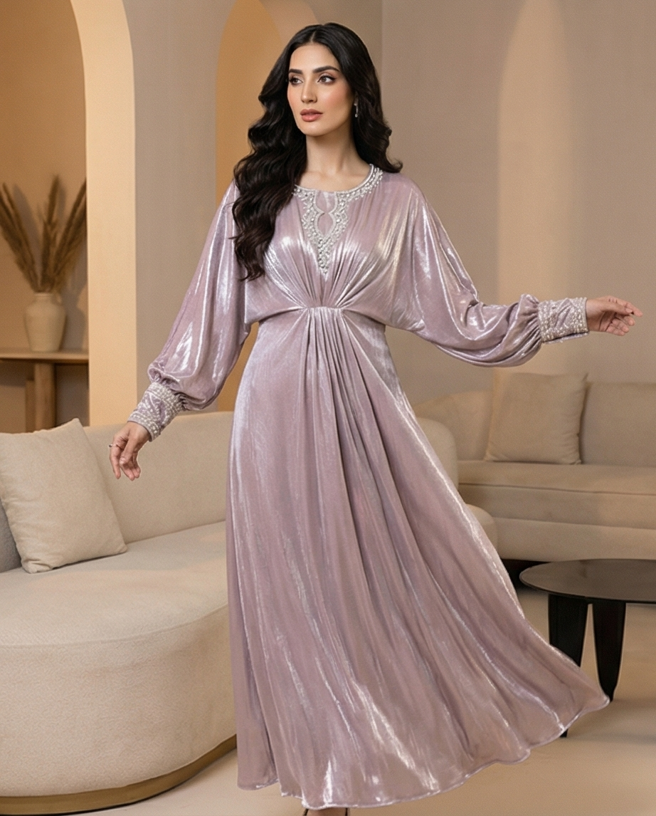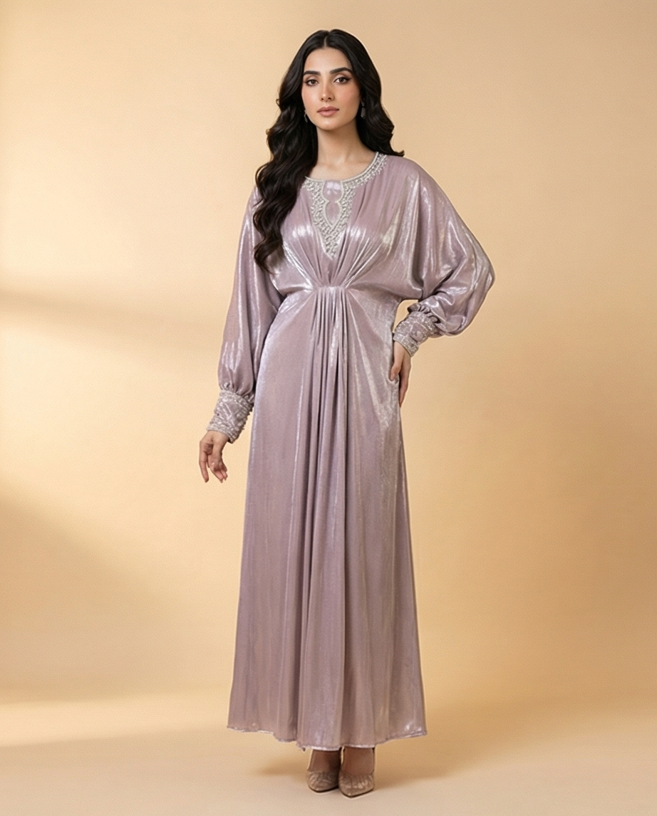 ​Elevate your wardrobe with the Pearl Iridescent Cotton Kaftan, a garment that exudes soft, ethereal beauty. This kaftan features a stunning pale lavender-pink iridescent finish, giving it a metallic glow that is both sophisticated and eye-catching. The design centers around a flattering pleated waist that creates a natural cinch, flowing into a voluminous, floor-length skirt that adds a statuesque grace to your movement.