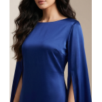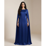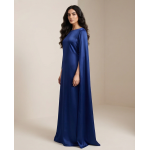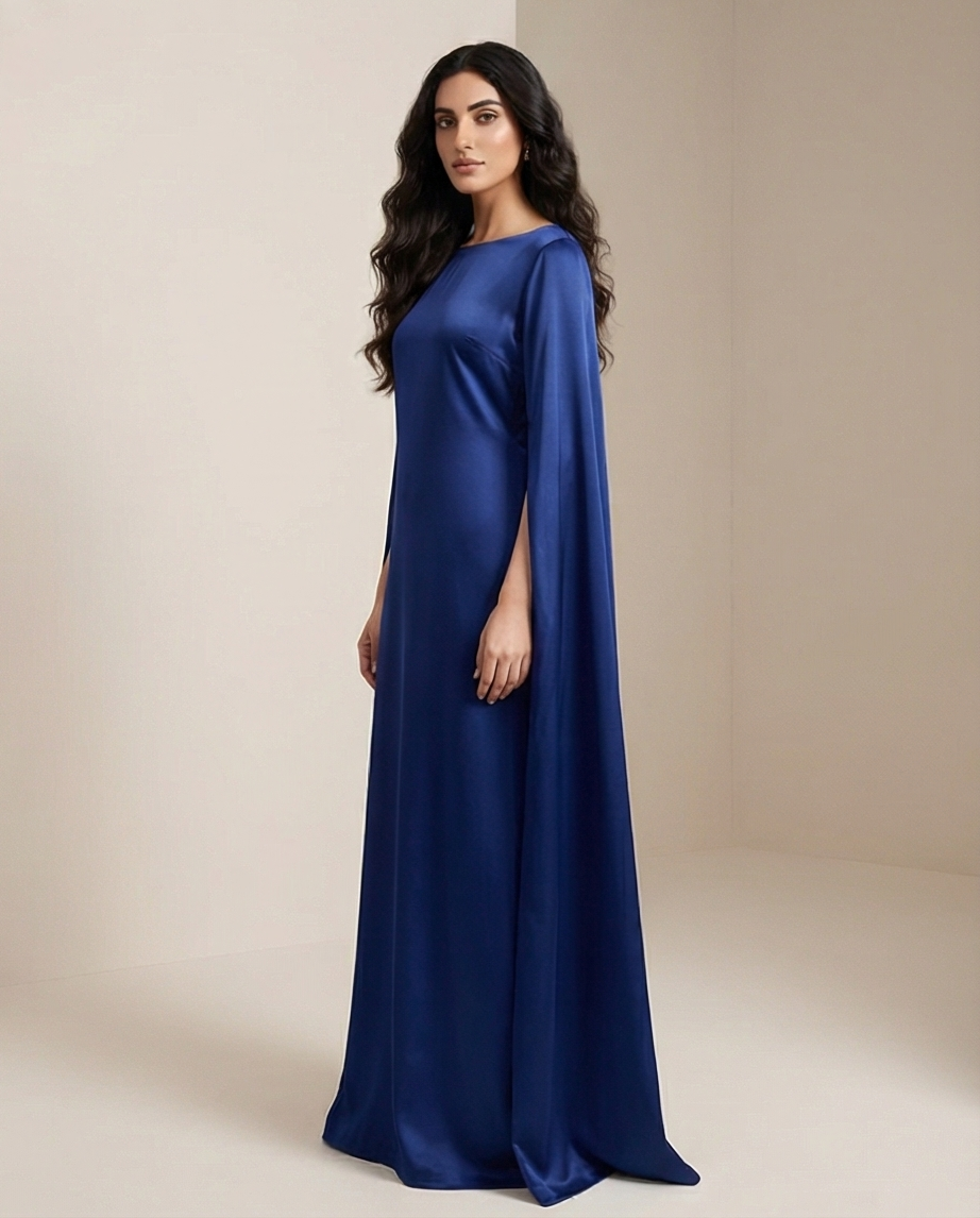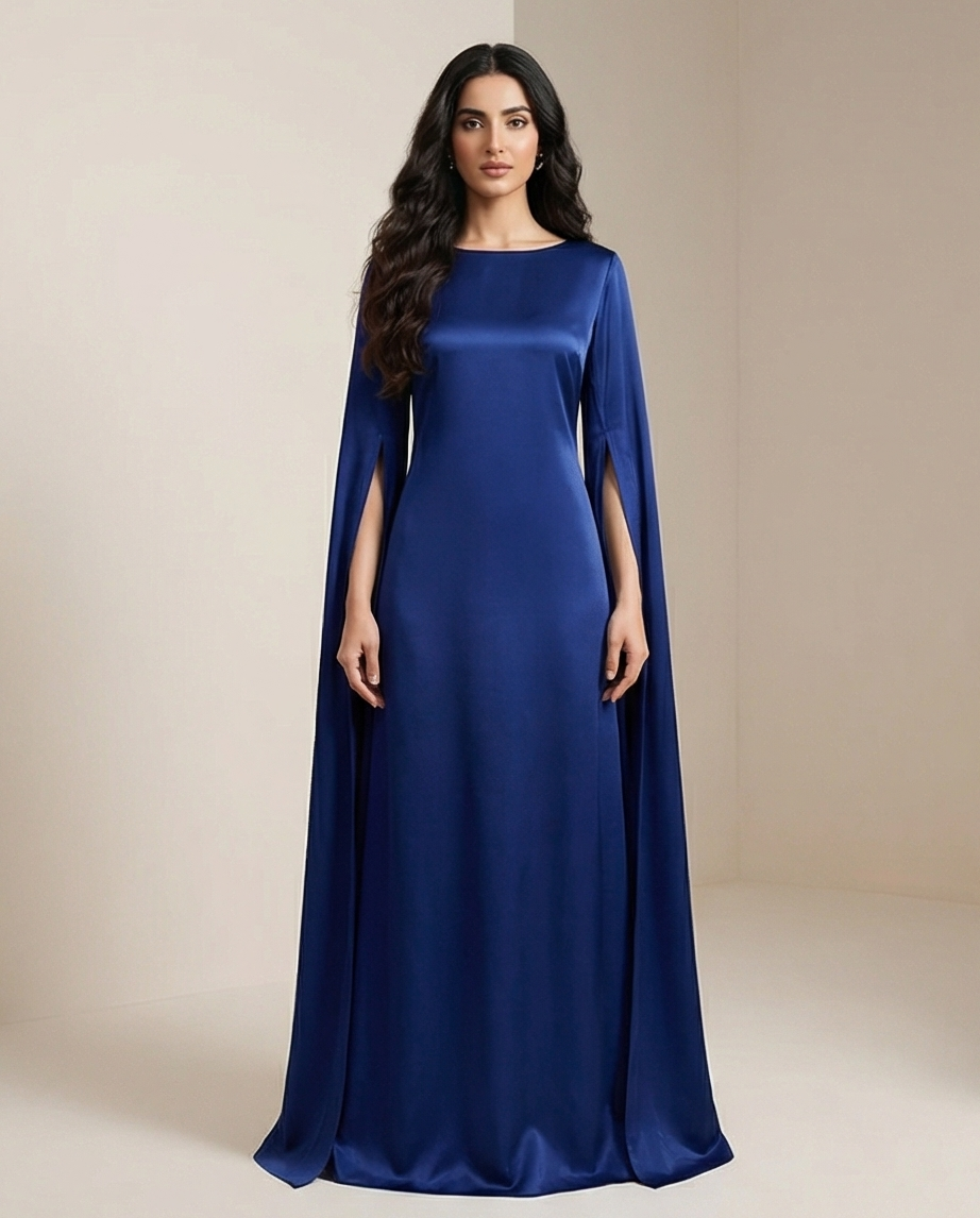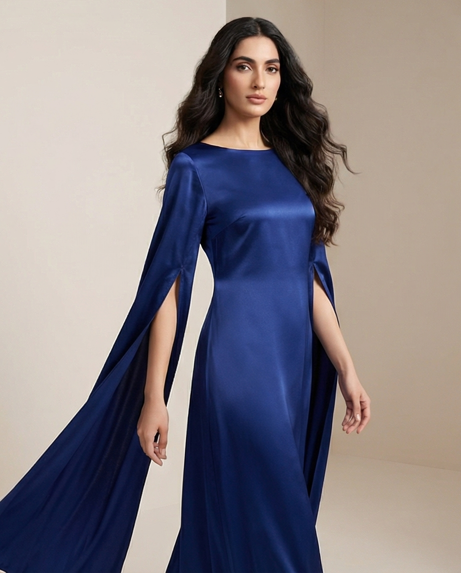 ​The defining feature of the Royal Blue Silk Cape Maxi is undoubtedly its avant-garde sleeve design. The long, split-hem sleeves create a dramatic “cape” effect that flows behind you as you walk, adding a sense of majestic movement to the garment. The bodice features a clean, boat neckline that offers a modest yet sophisticated frame for the collarbone.