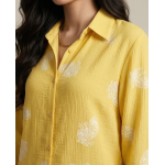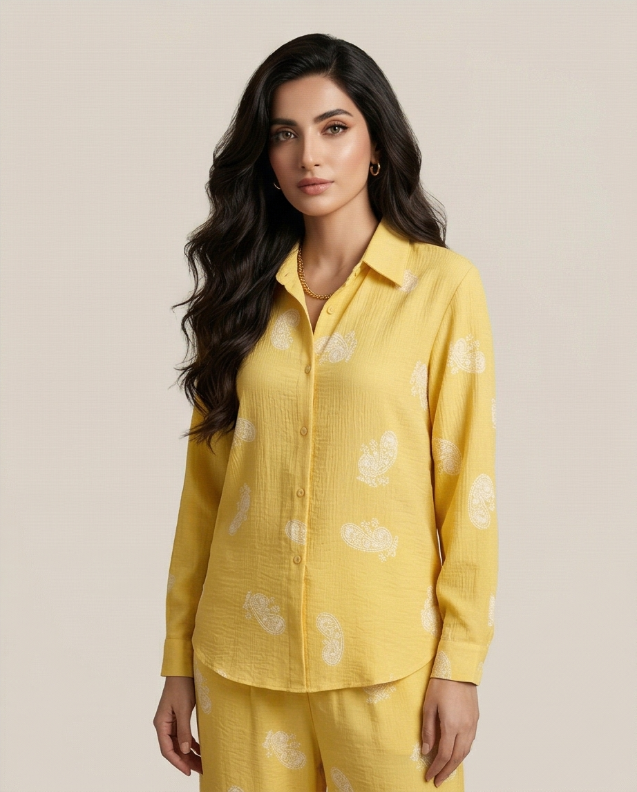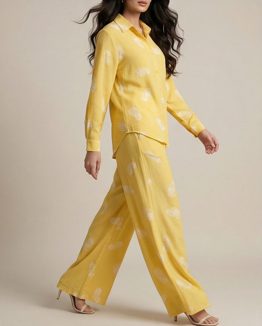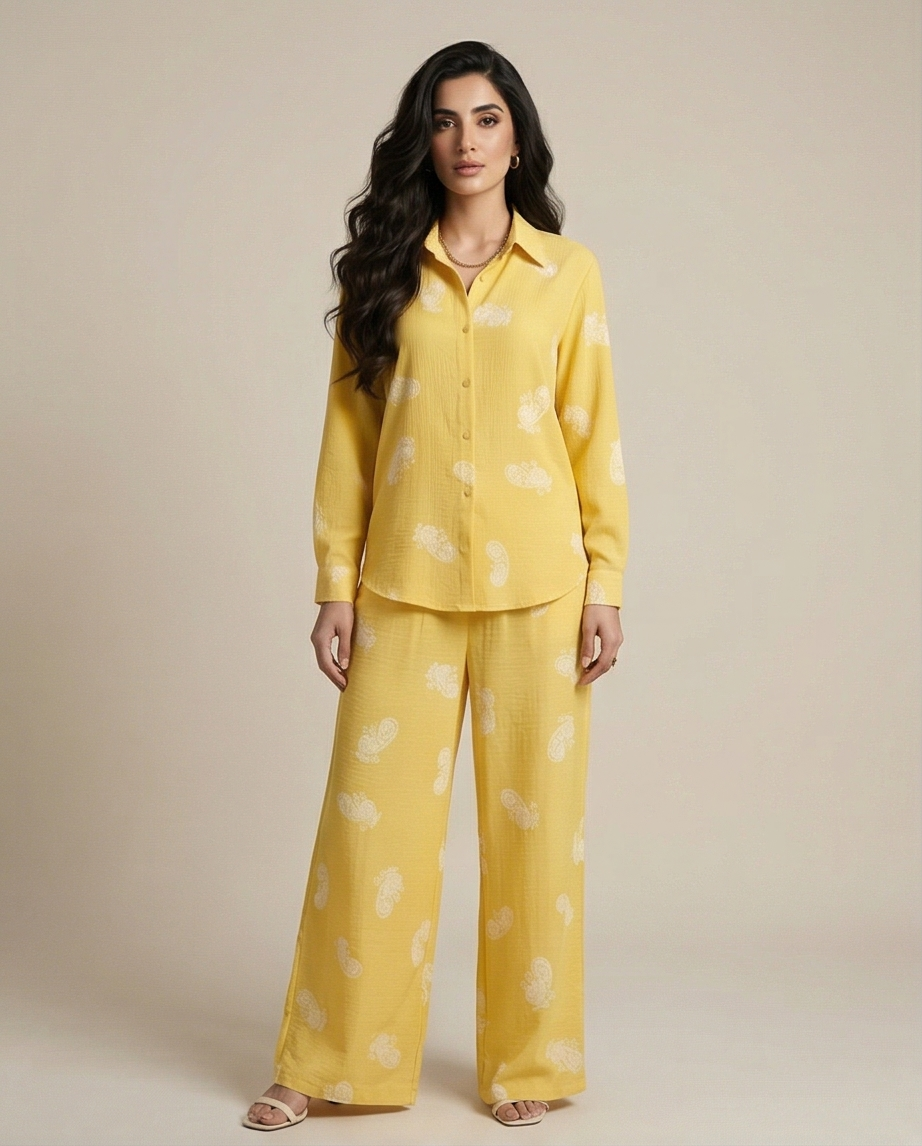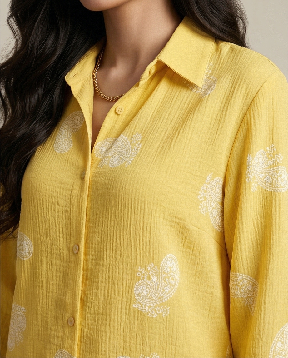 Brighten up your seasonal wardrobe with our Sunshine Paisley Irish Linen Co-ord Set. This radiant two-piece ensemble is crafted from premium Irish linen, known for its distinct breathable texture and effortless drape. Featuring a cheerful mustard-yellow base accented with delicate white paisley motifs, this set is designed to keep you feeling cool and looking vibrant.