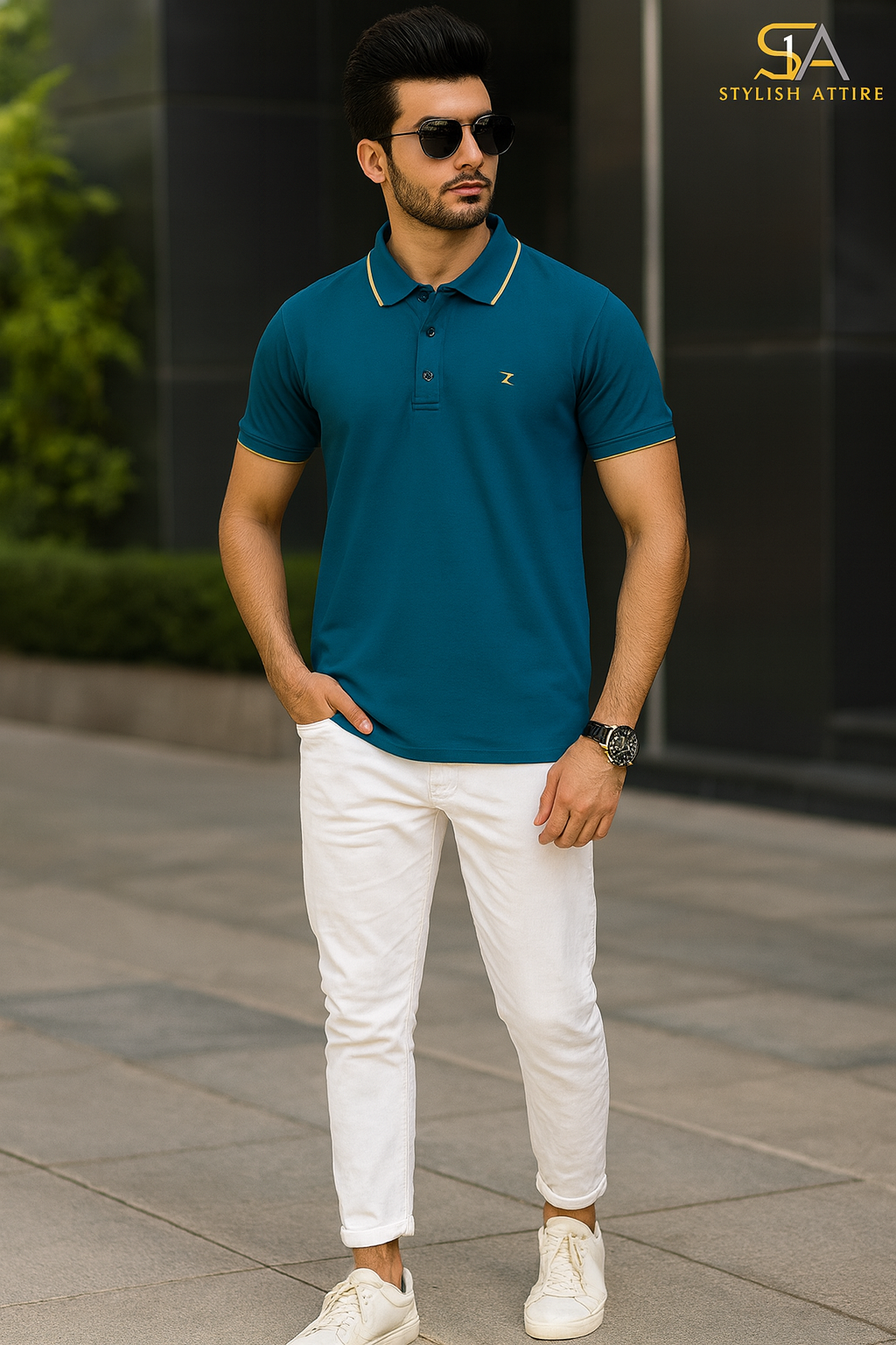 The Teal Blue Polo T-Shirt adapts seamlessly to any occasion. For a casual weekend vibe, pair it with white chinos and sneakers for a sharp yet relaxed look. For a more refined evening outfit, combine it with dark jeans and loafers. Its versatile tone makes it a wardrobe essential that bridges the gap between casual and smart dressing.