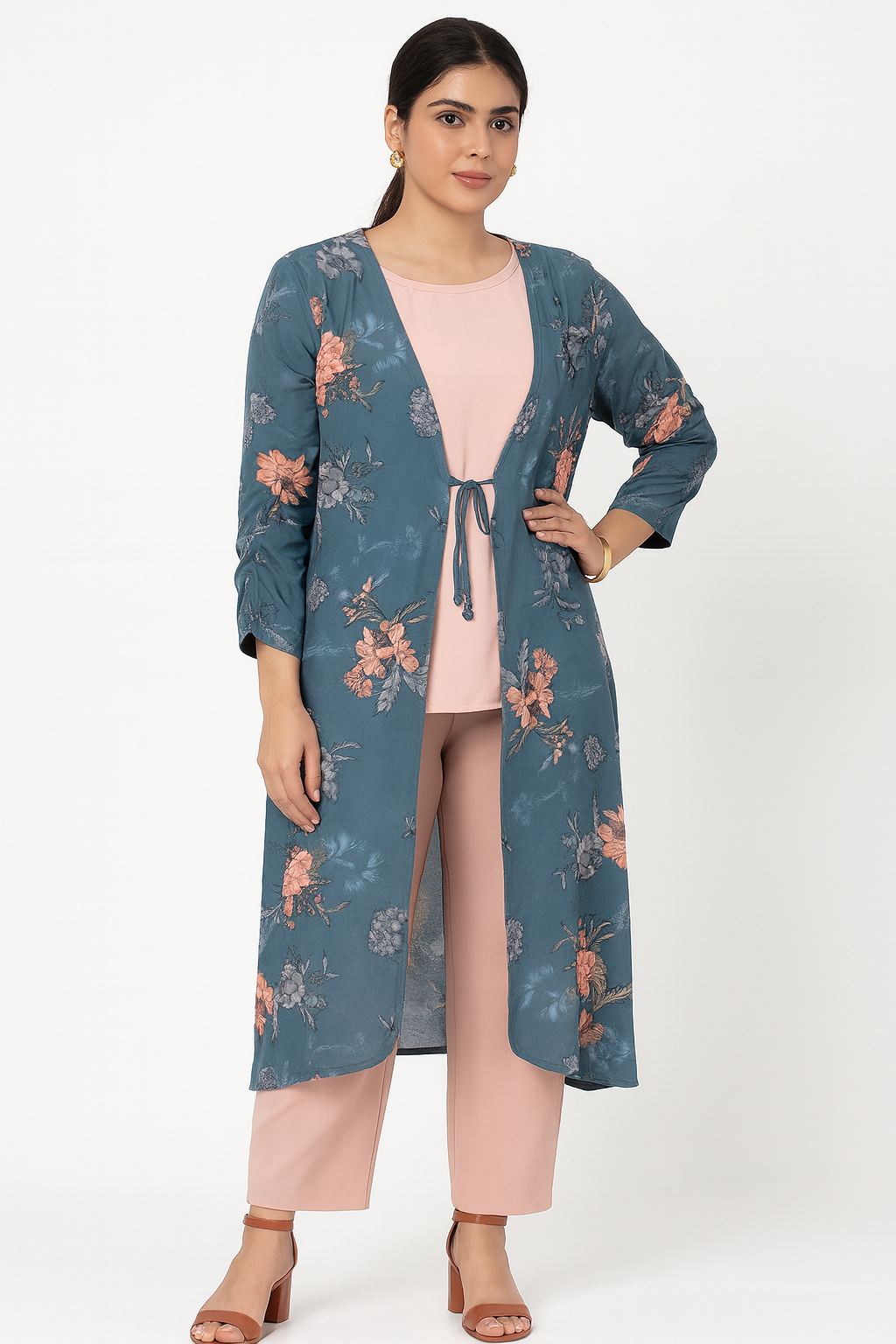 The outer shrug features a beautiful teal base adorned with delicate floral prints in shades of blush pink and soft coral, creating a feminine yet sophisticated aesthetic. The lightweight linen biski fabric drapes gracefully, offering a flowy silhouette that flatters every body shape. With its open-front style and a subtle tie detail at the waist, this shrug allows you to style it your way—whether you prefer leaving it open for a breezy, casual look or tied for a more defined shape. The three-quarter sleeves and longline length make it perfect for layering across all seasons, adding a chic touch to any outfit.