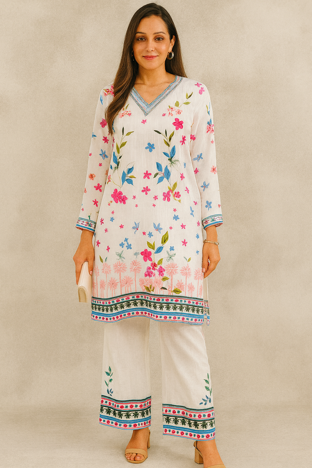 Complementing the kurta, the matching white trousers complete the look with embroidered floral motifs near the hemline, echoing the kurta’s prints for a coordinated finish. The wide-leg design ensures a relaxed fit, offering freedom of movement without compromising on style. Together, the kurta and trousers create a harmonious blend of color, pattern, and sophistication.